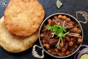 Taste freshly baked Amritsari kulcha served with flavorful chickpea curry, yogurt, pickles, and traditional spices — a classic North Indian meal in Surrey.